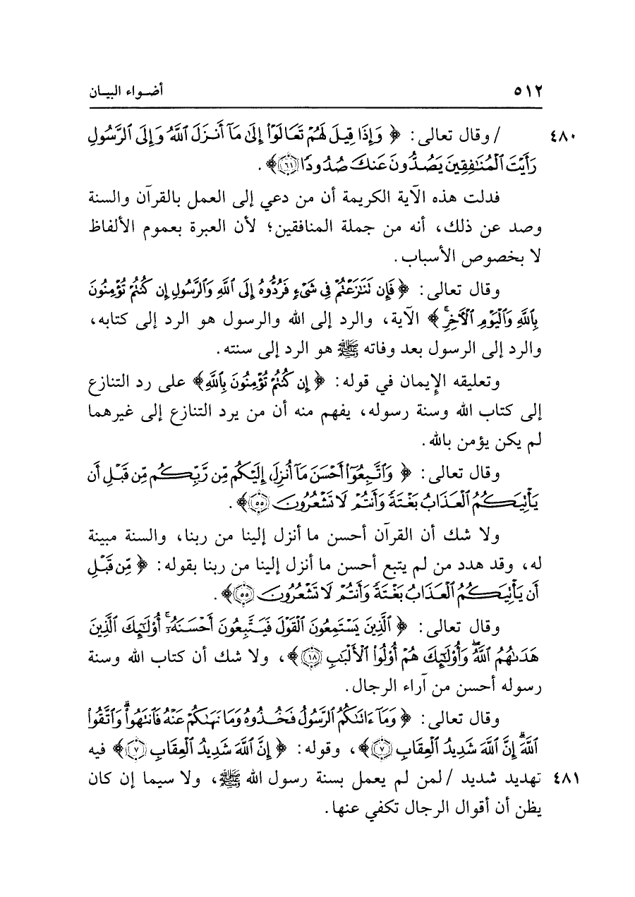 وقال تعالى: {فَإِنْ تَنَازَعْتُمْ فِي شَيءٍ فَرُدُّوهُ إِلَى اللَّهِ وَالرَّسُولِ إِنْ كُنْتُمْ تُؤْمِنُونَ بِاللَّهِ وَالْيَوْمِ الْآخِرِ} الآية، والرد إلى الله والرسول هو الرد إلى كتابه، والرد إلى الرسول بعد وفاته - صلى الله عليه وسلم - هو الرد إلى سنته.