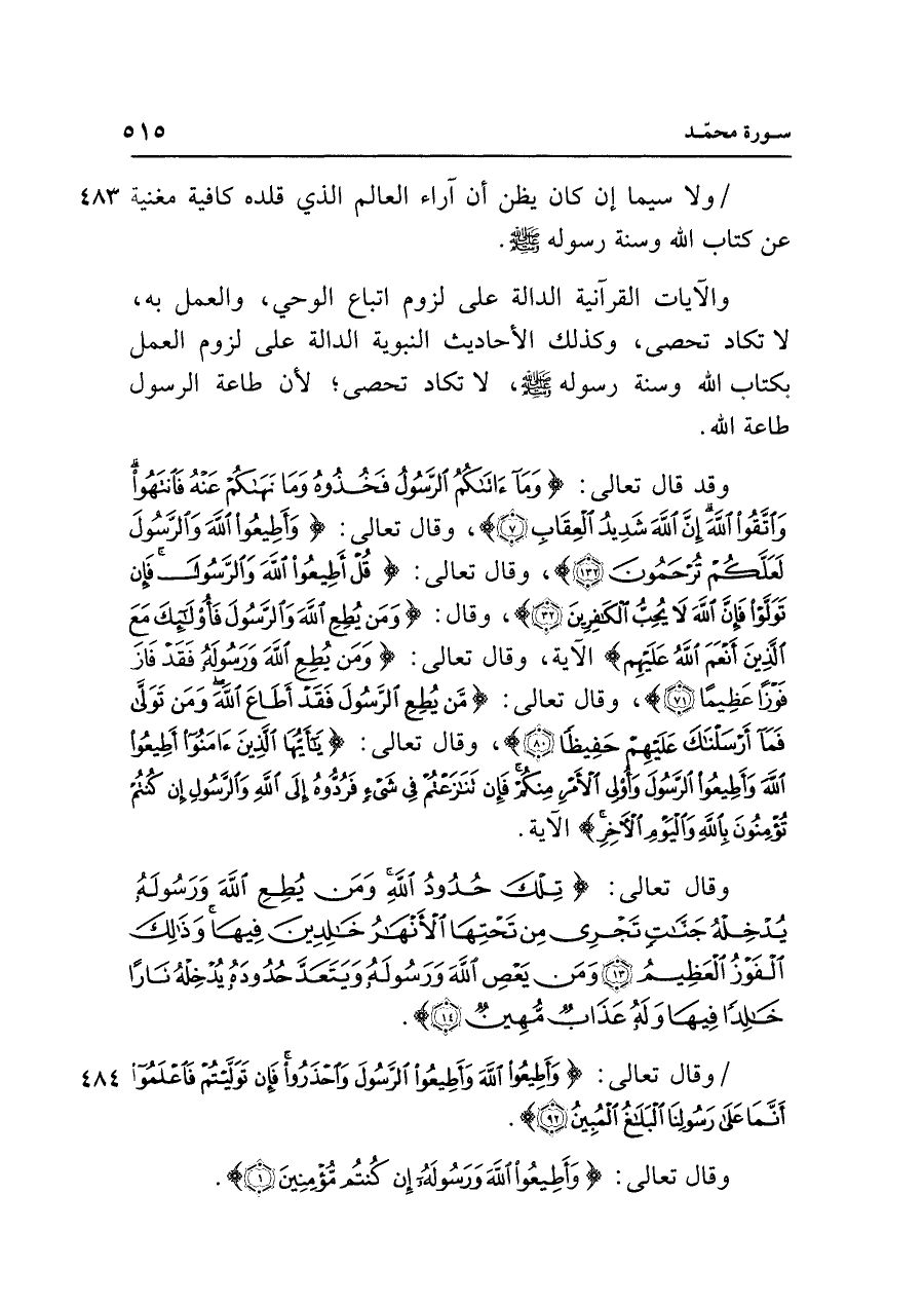 وقد قال تعالى: {وَمَا آتَاكُمُ الرَّسُولُ فَخُذُوهُ وَمَا نَهَاكُمْ عَنْهُ فَانْتَهُوا وَاتَّقُوا اللَّهَ إِنَّ اللَّهَ شَدِيدُ الْعِقَابِ (٧)}، وقال تعالى: {وَأَطِيعُوا اللَّهَ وَالرَّسُولَ لَعَلَّكُمْ تُرْحَمُونَ (١٣٢)}، وقال تعالى: {قُلْ أَطِيعُوا اللَّهَ وَالرَّسُولَ فَإِنْ تَوَلَّوْا فَإِنَّ اللَّهَ لَا يُحِبُّ الْكَافِرِينَ (٣٢)}، وقال: {وَمَنْ يُطِعِ اللَّهَ وَالرَّسُولَ فَأُولَئِكَ مَعَ الَّذِينَ أَنْعَمَ اللَّهُ عَلَيهِمْ} الآية، وقال تعالى: {وَمَنْ يُطِعِ اللَّهَ وَرَسُولَهُ فَقَدْ فَازَ فَوْزًا عَظِيمًا (٧١)}، وقال تعالى: {مَنْ يُطِعِ الرَّسُولَ فَقَدْ أَطَاعَ اللَّهَ وَمَنْ تَوَلَّى فَمَا أَرْسَلْنَاكَ عَلَيهِمْ حَفِيظًا (٨٠)}، وقال تعالى: {يَا أَيُّهَا الَّذِينَ آمَنُوا أَطِيعُوا اللَّهَ وَأَطِيعُوا الرَّسُولَ وَأُولِي الْأَمْرِ مِنْكُمْ فَإِنْ تَنَازَعْتُمْ فِي شَيءٍ فَرُدُّوهُ إِلَى اللَّهِ وَالرَّسُولِ إِنْ كُنْتُمْ تُؤْمِنُونَ بِاللَّهِ وَالْيَوْمِ الْآخِرِ} الآية.
