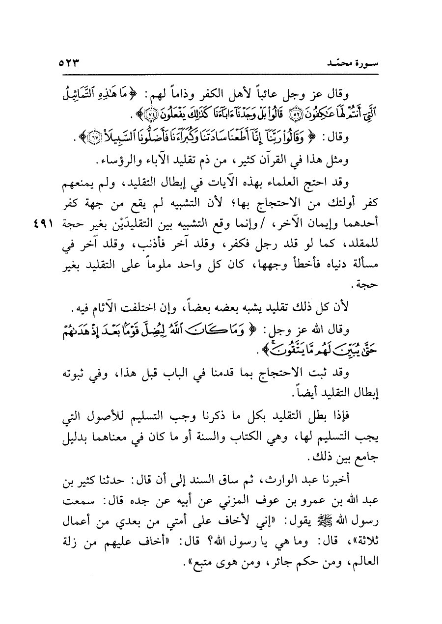 وقد احتج العلماء بهذه الآيات في إبطال التقليد، ولم يمنعهم كفر أولئك من الاحتجاج بها؛ لأن التشبيه لم يقع من جهة كفر أحدهما وإيمان الآخر، وإنما وقع التشبيه بين التقليدَين بغير حجة للمقلد، كما لو قلد رجل فكفر، وقلد آخر فأذنب، وقلد آخر في مسألة دنياه فأخطأ وجهها، كان كل واحد ملومًا على التقليد بغير حجة.