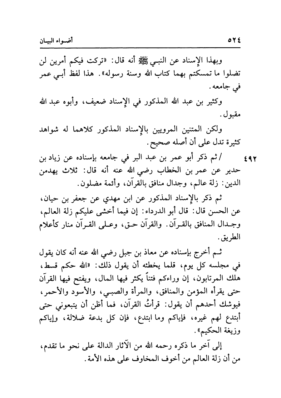 ثم ذكر أبو عمر بن عبد البر في جامعه بإسناده عن زياد بن حدير عن عمر بن الخطاب رضي الله عنه أنه قال: ثلاث يهدمن الدين: زلة عالم، وجدال منافق بالقرآن، وأئمة مضلون.