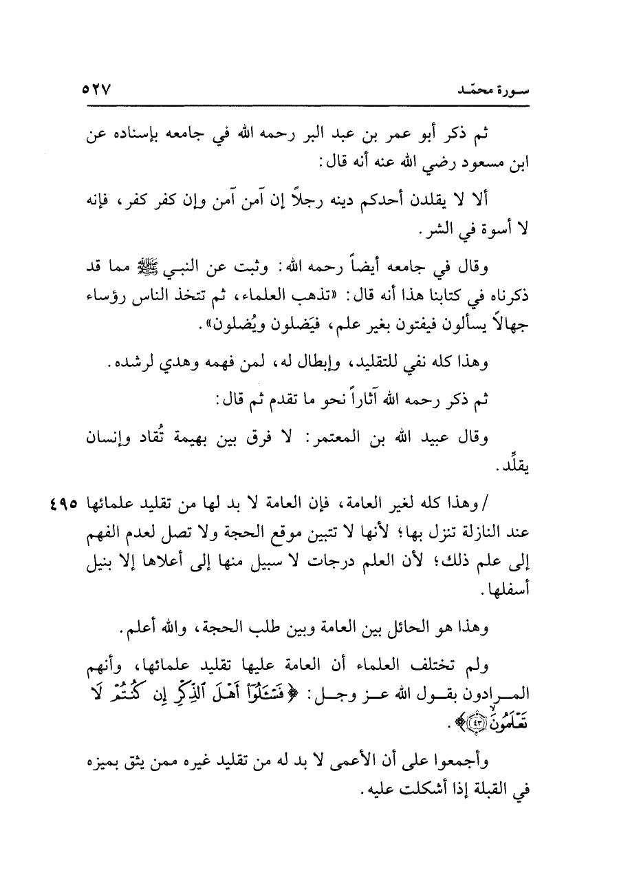 ولم تختلف العلماء أن العامة عليها تقليد علمائها، وأنهم المرادون بقول الله عزَّ وجلَّ: {فَاسْأَلُوا أَهْلَ الذِّكْرِ إِنْ كُنْتُمْ لَا تَعْلَمُونَ (٤٣)}.