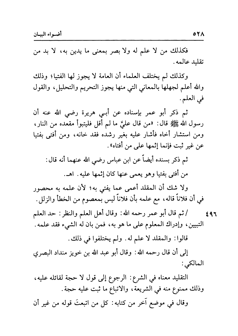فكذلك من لا علم له ولا بصر بمعنى ما يدين به، لا بد من تقليد عالمه.