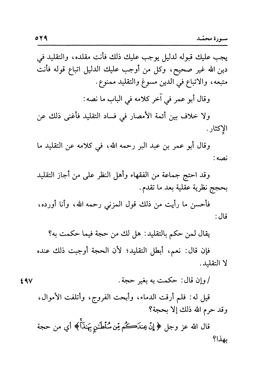 وقال أبو عمر بن عبد البر رحمه الله، في كلامه عن التقليد ما نصه: