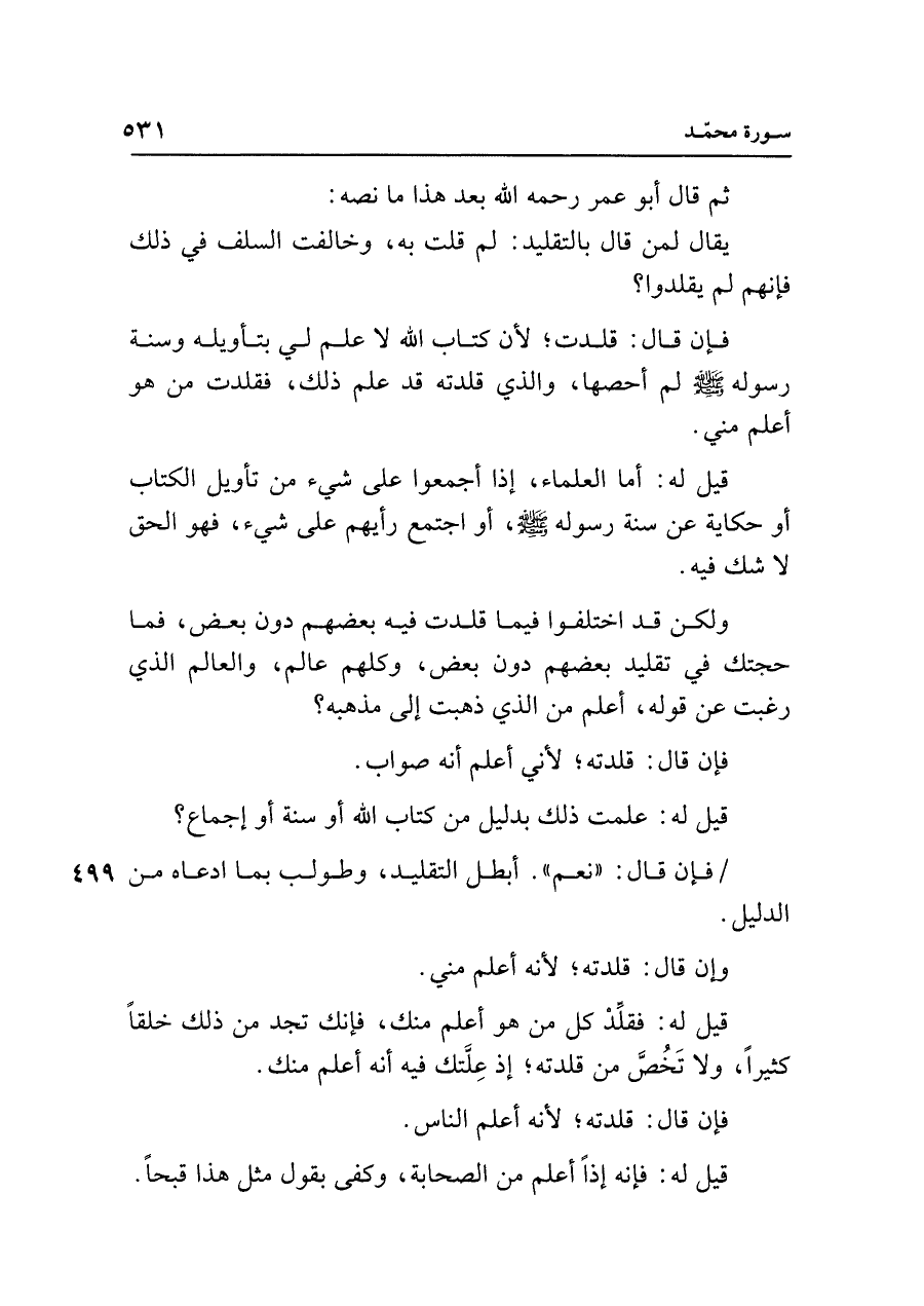 فإن قال: قلدت؛ لأن كتاب الله لا علم لي بتأويله وسنة رسوله - صلى الله عليه وسلم - لم أحصها، والذي قلدته قد علم ذلك، فقلدت من هو أعلم مني.