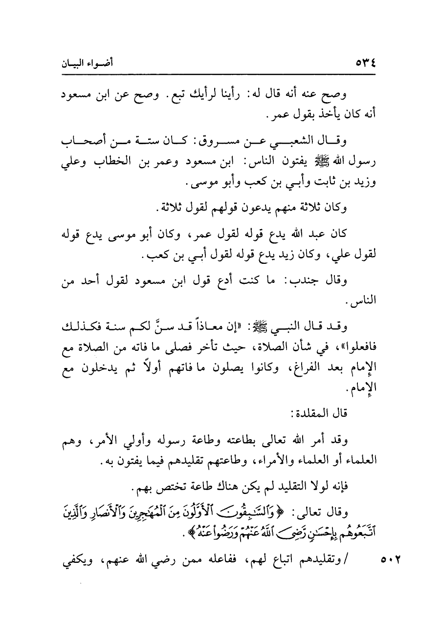 وتقليدهم اتباع لهم، ففاعله ممن رضي الله عنهم، ويكفي