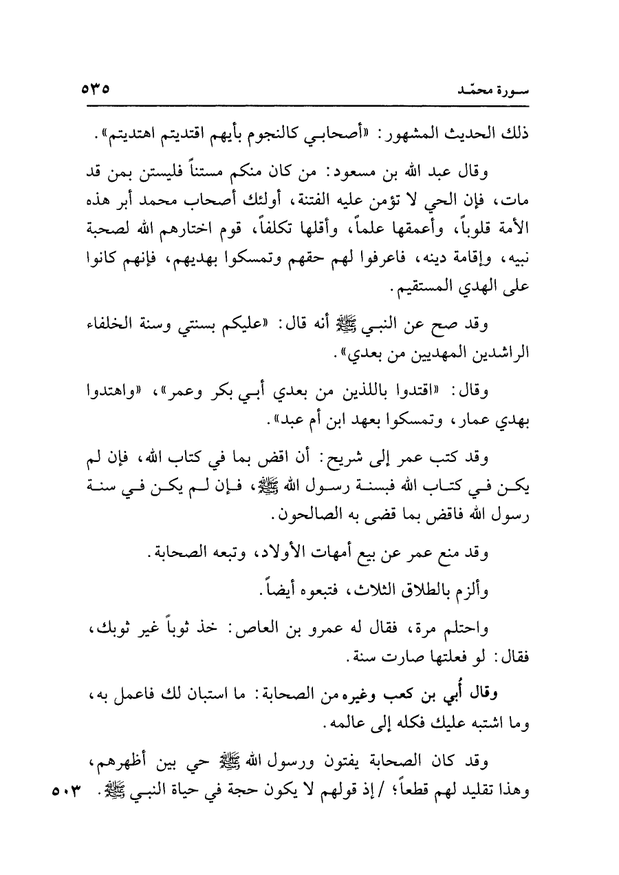 وقال عبد الله بن مسعود: من كان منكم مستنًا فليستن بمن قد مات، فإن الحي لا تؤمن عليه الفتنة، أولئك أصحاب محمد أبر هذه الأمة قلوبًا، وأعمقها علمًا، وأقلها تكلفًا، قوم اختارهم الله لصحبة نبيه، وإقامة دينه، فاعرفوا لهم حقهم وتمسكوا بهديهم، فإنهم كانوا على الهدي المستقيم.