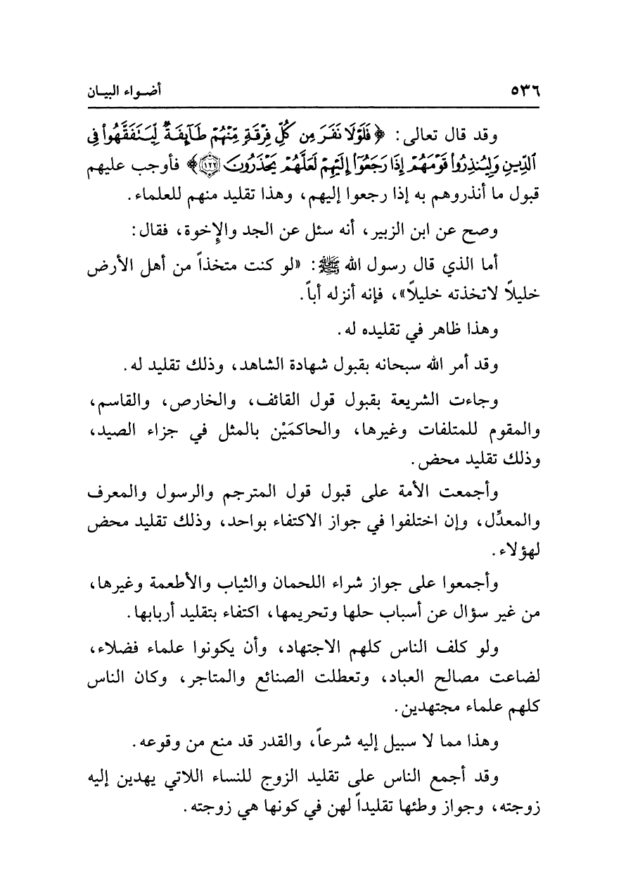 وقد قال تعالى: {فَلَوْلَا نَفَرَ مِنْ كُلِّ فِرْقَةٍ مِنْهُمْ طَائِفَةٌ لِيَتَفَقَّهُوا فِي الدِّينِ وَلِيُنْذِرُوا قَوْمَهُمْ إِذَا رَجَعُوا إِلَيهِمْ لَعَلَّهُمْ يَحْذَرُونَ (١٢٢)} فأوجب عليهم قبول ما أنذروهم به إذا رجعوا إليهم، وهذا تقليد منهم للعلماء.