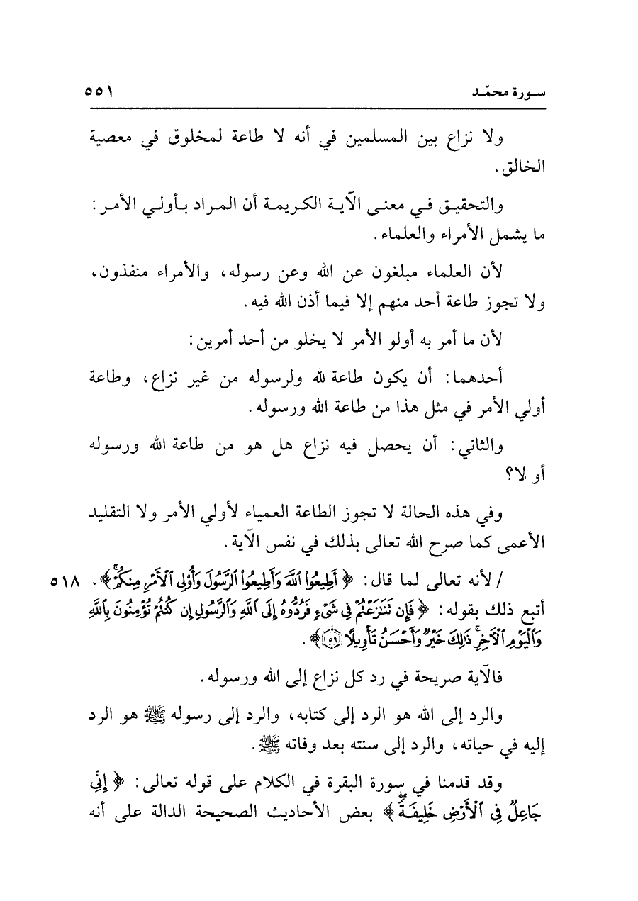 وفي هذه الحالة لا تجوز الطاعة العمياء لأولي الأمر ولا التقليد الأعمى كما صرح الله تعالى بذلك في نفس الآية.