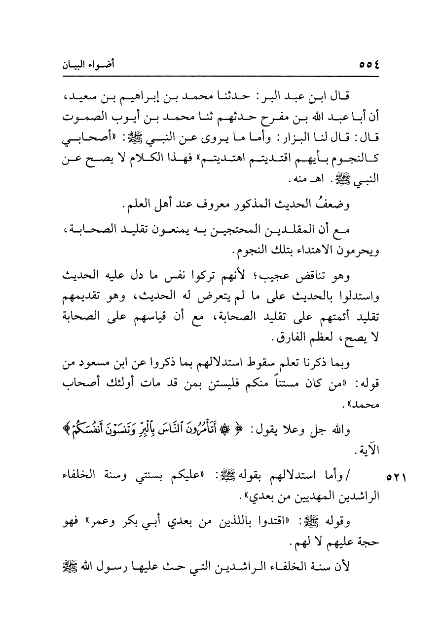مع أن المقلدين المحتجين به يمنعون تقليد الصحابة، ويحرمون الاهتداء بتلك النجوم.