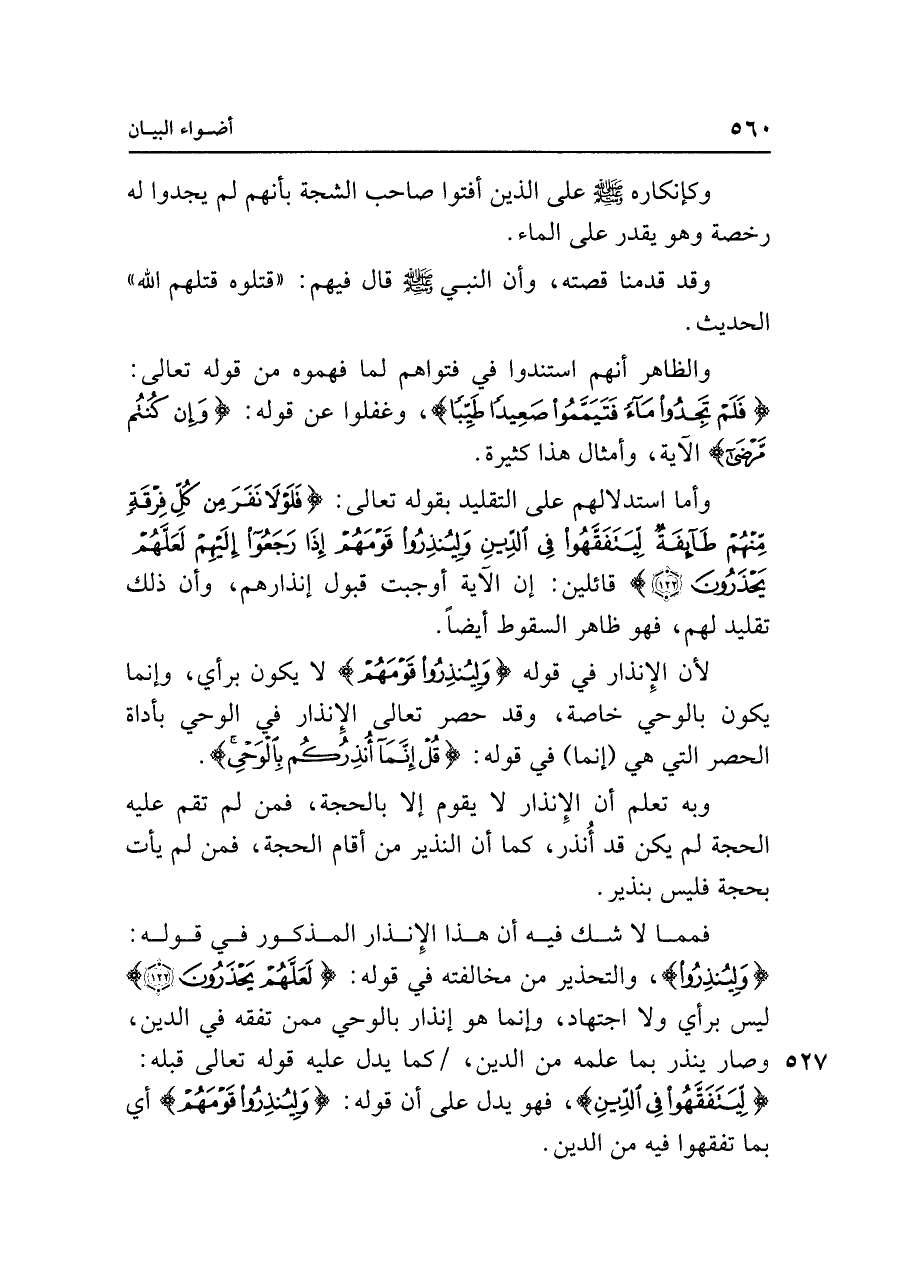 فمما لا شك فيه أن هذا الإِنذار المذكور في قوله: {وَلِيُنْذِرُوا}، والتحذير من مخالفته في قوله: {لَعَلَّهُمْ يَحْذَرُونَ (١٢٢)} ليس برأي ولا اجتهاد، وإنما هو إنذار بالوحي ممن تفقه في الدين، وصار ينذر بما علمه من الدين، كما يدل عليه قوله تعالى قبله: {لِيَتَفَقَّهُوا فِي الدِّينِ}، فهو يدل على أن قوله: {وَلِيُنْذِرُوا قَوْمَهُمْ} أي بما تفقهوا فيه من الدين.