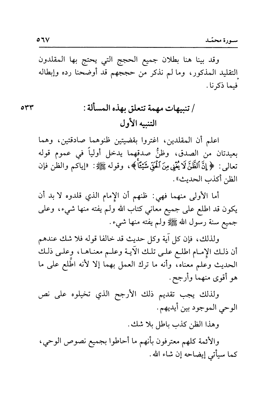 اعلم أن المقلدين، اغتروا بقضيتين ظنوهما صادقتين، وهما بعيدتان من الصدق، وظنُّ صدقهما يدخل أوليًّا في عموم قوله تعالى: {إِنَّ الظَّنَّ لَا يُغْنِي مِنَ الْحَقِّ شَيئًا}، وقوله - صلى الله عليه وسلم - : "إياكم والظن فإن الظن أكذب الحديث".