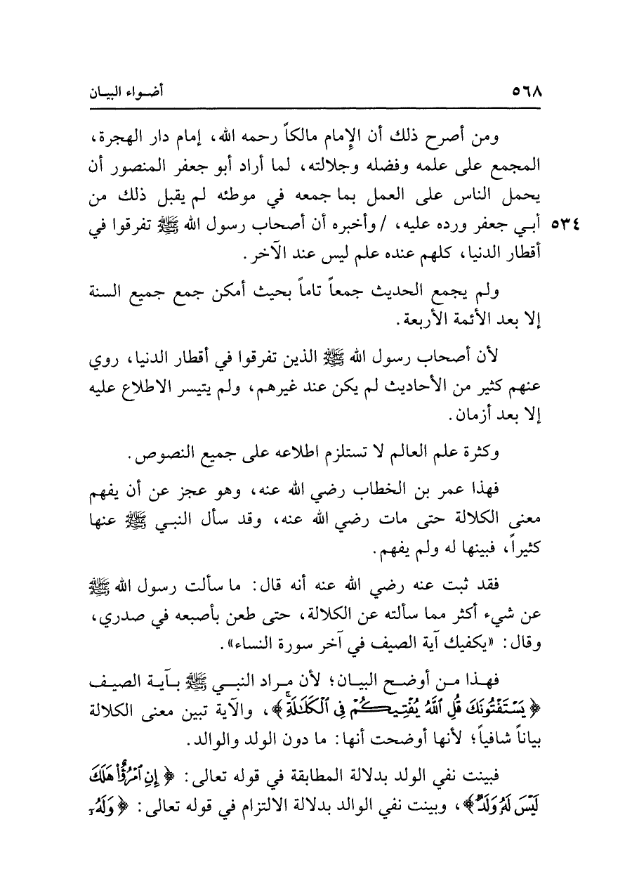 فهذا من أوضح البيان؛ لأن مراد النبي - صلى الله عليه وسلم - بآية الصيف {يَسْتَفْتُونَكَ قُلِ اللَّهُ يُفْتِيكُمْ فِي الْكَلَالةِ}، والآية تبين معنى الكلالة بيانًا شافيًا؛ لأنها أوضحت أنها: ما دون الولد والوالد.