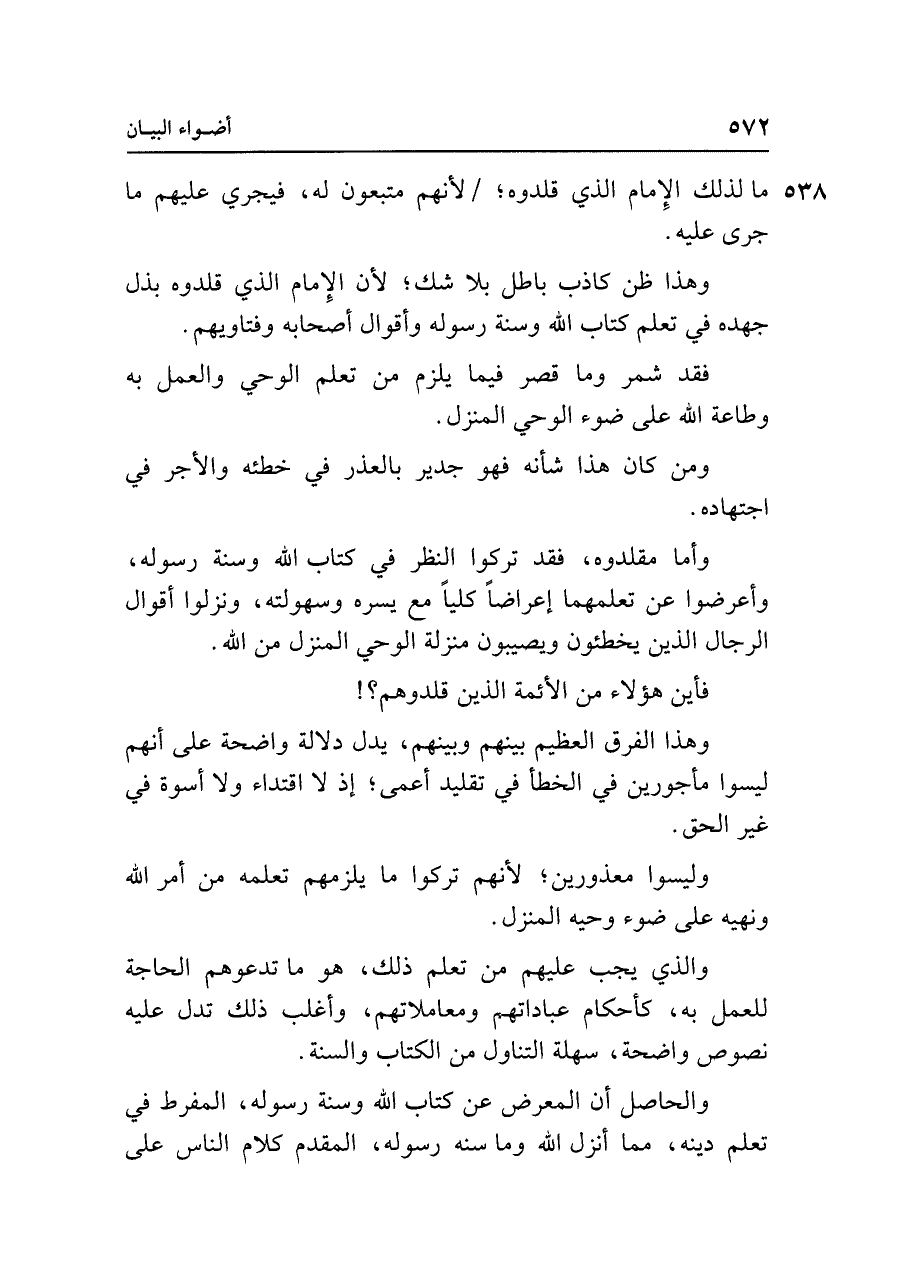 وأما مقلدوه، فقد تركوا النظر في كتاب الله وسنة رسوله، وأعرضوا عن تعلمهما إعراضًا كليًّا مع يسره وسهولته، ونزلوا أقوال الرجال الذين يخطئون ويصيبون منزلة الوحي المنزل من الله.