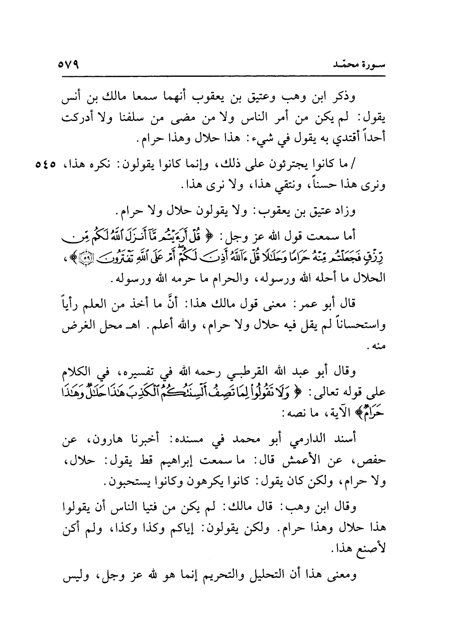 وقال أبو عبد الله القرطبي رحمه الله في تفسيره، في الكلام على قوله تعالى: {وَلَا تَقُولُوا لِمَا تَصِفُ أَلْسِنَتُكُمُ الْكَذِبَ هَذَا حَلَالٌ وَهَذَا حَرَامٌ} الآية، ما نصه:
