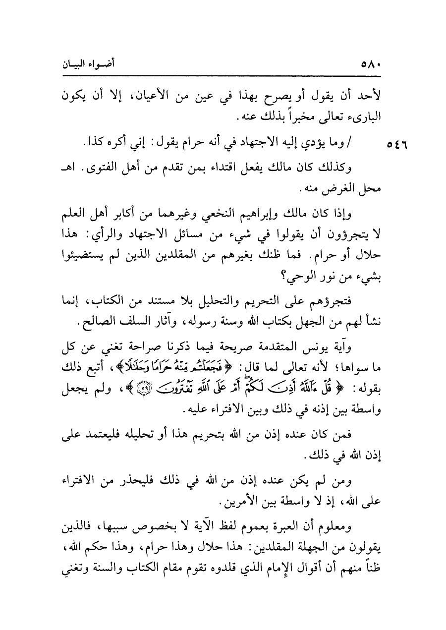 وآية يونس المتقدمة صريحة فيما ذكرنا صراحة تغني عن كل ما سواها؛ لأنه تعالى لما قال: {فَجَعَلْتُمْ مِنْهُ حَرَامًا وَحَلَالًا}، أتبع ذلك بقوله: {قُلْ آللَّهُ أَذِنَ لَكُمْ أَمْ عَلَى اللَّهِ تَفْتَرُونَ (٥٩)}، ولم يجعل واسطة بين إذنه في ذلك وبين الافتراء عليه.