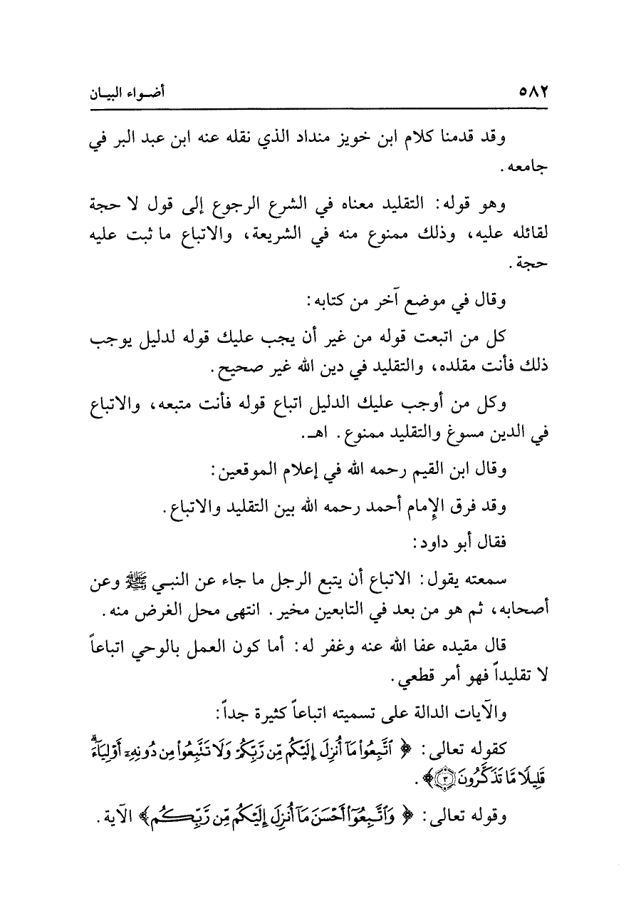 وكل من أوجب عليك الدليل اتباع قوله فأنت متبعه، والاتباع في الدين مسوغ والتقليد ممنوع. اهـ.