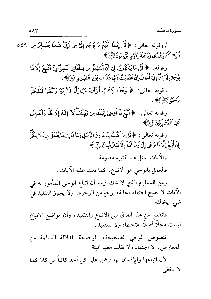 ومن المعلوم الذي لا شك فيه، أن اتباع الوحي المأمور به في الآيات لا يصح اجتهاد يخالفه بوجهٍ من الوجوه، ولا يجوز التقليد في شيء يخالفه.