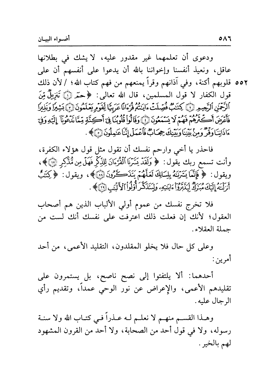 فاحذر يا أخي وارحم نفسك أن تقول مثل قول هؤلاء الكفرة، وأنت تسمع ربك يقول: {وَلَقَدْ يَسَّرْنَا الْقُرْآنَ لِلذِّكْرِ فَهَلْ مِنْ مُدَّكِرٍ (١٧)}، ويقول: {فَإِنَّمَا يَسَّرْنَاهُ بِلِسَانِكَ لَعَلَّهُمْ يَتَذَكَّرُونَ (٥٨)}، ويقول: {كِتَابٌ أَنْزَلْنَاهُ إِلَيكَ مُبَارَكٌ لِيَدَّبَّرُوا آيَاتِهِ وَلِيَتَذَكَّرَ أُولُو الْأَلْبَابِ (٢٩)}.