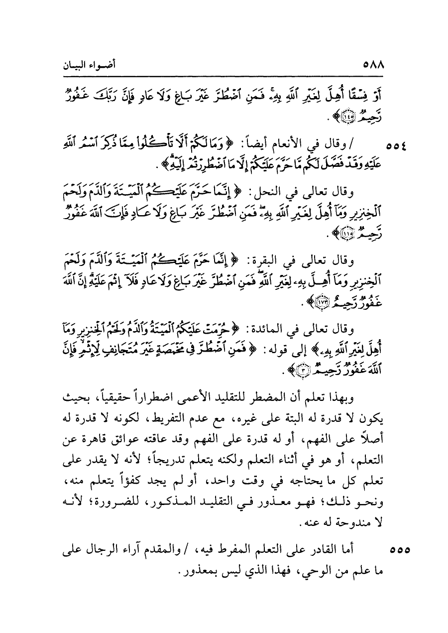 وبهذا تعلم أن المضطر للتقليد الأعمى اضطرارًا حقيقيًّا، بحيث يكون لا قدرة له البتة على غيره، مع عدم التفريط، لكونه لا قدرة له أصلًا على الفهم، أو له قدرة على الفهم وقد عاقته عوائق قاهرة عن التعلم، أو هو في أثناء التعلم ولكنه يتعلم تدريجًا؛ لأنه لا يقدر على تعلم كل ما يحتاجه في وقت واحد، أولم يجد كفؤًا يتعلم منه، ونحو ذلك؛ فهو معذور في التقليد المذكور، للضرورة، لأنه لا مندوحة له عنه.