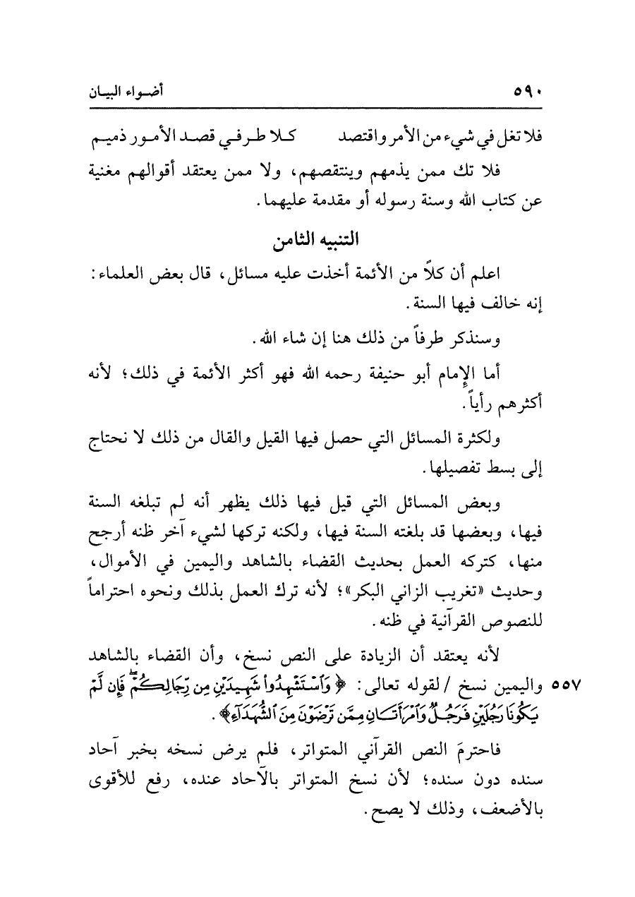 وبعض المسائل التي قيل فيها ذلك يظهر أنه لم تبلغه السنة فيها، وبعضها قد بلغته السنة فيها، ولكنه تركها لشيء آخر ظنه أرجح منها، كتركه العمل بحديث القضاء بالشاهد واليمين في الأموال، وحديث "تغريب الزاني البكر"؛ لأنه ترك العمل بذلك ونحوه احترامًا للنصوص القرآنية في ظنه.
