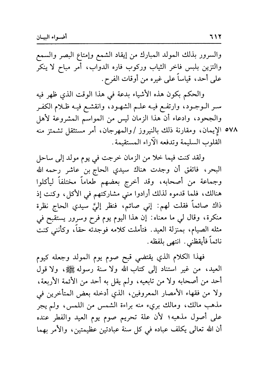 ولقد كنت فيما خلا من الزمان خرجت في يوم مولد إلى ساحل البحر، فاتفق أن وجدت هناك سيدي الحاج بن عاشر رحمه الله وجماعة من أصحابه، وقد أخرج بعضهم طعامًا مختلفًا ليأكلوا هنالك، فلما قدموه لذلك أرادوا مني مشاركتهم في الأكل، وكنت إذ ذاك صائمًا فقلت لهم: إني صائم، نظر إليَّ سيدي الحاج نظرة منكرة، وقال لي ما معناه: إن هذا اليوم يوم فرح وسرور يستقبح في مثله الصيام، بمنزلة العيد. فتأملت كلامه فوجدته حقًّا، وكأنني كنت نائما فأيقظني. انتهى بلفظه.