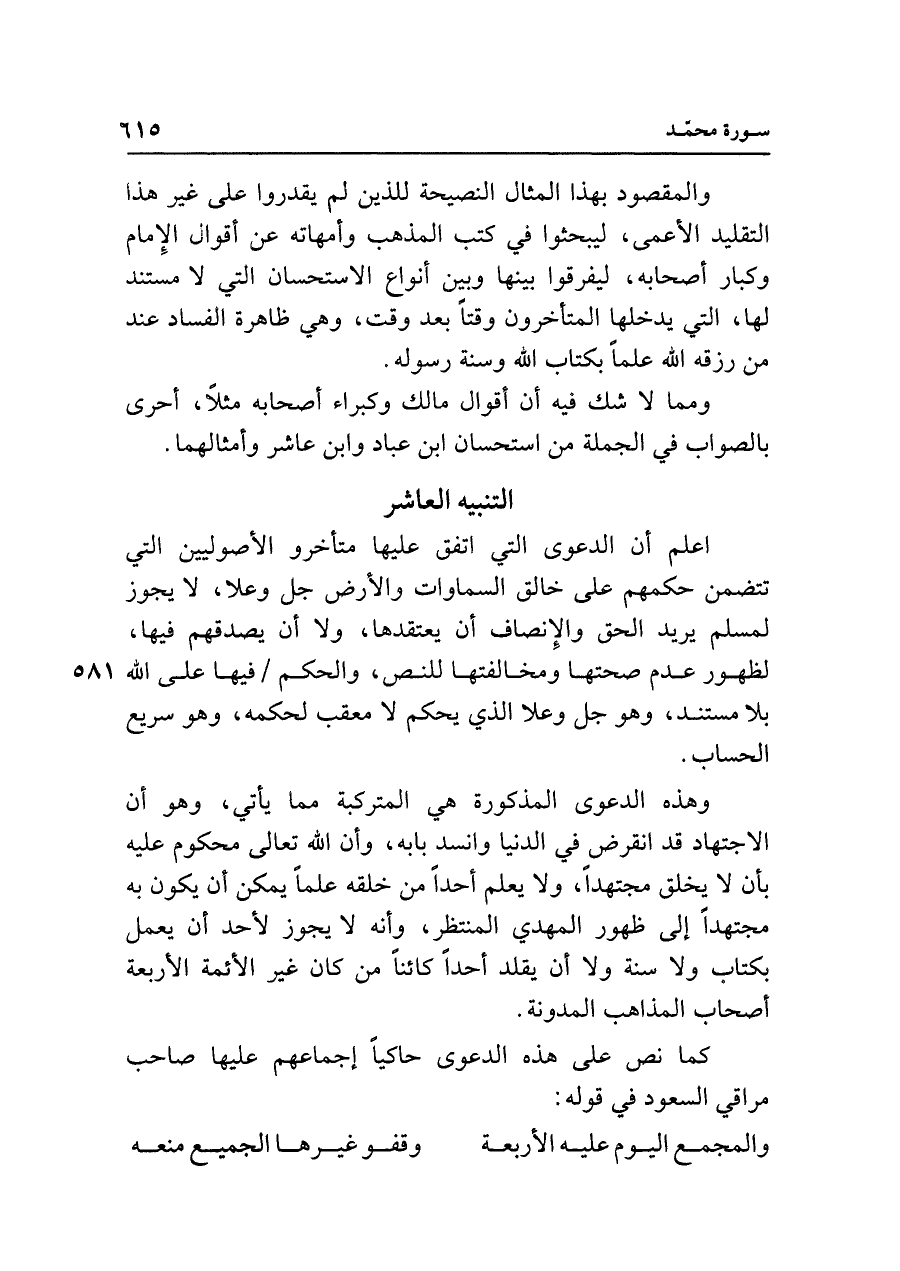 وهذه الدعوى المذكورة هي المتركبة مما يأتي، وهو أن الاجتهاد قد انقرض في الدنيا وانسد بابه، وأن الله تعالى محكوم عليه بأن لا يخلق مجتهدًا، ولا يعلم أحدا من خلقه علمًا يمكن أن يكون له مجتهدا إلى ظهور المهدي المنتظر، وأنه لا يجوز لأحد أن يعمل لكتاب ولا سنة ولا أن يقلد أحدًا كائنًا من كان غير الأئمة الأربعة أصحاب المذاهب المدونة.