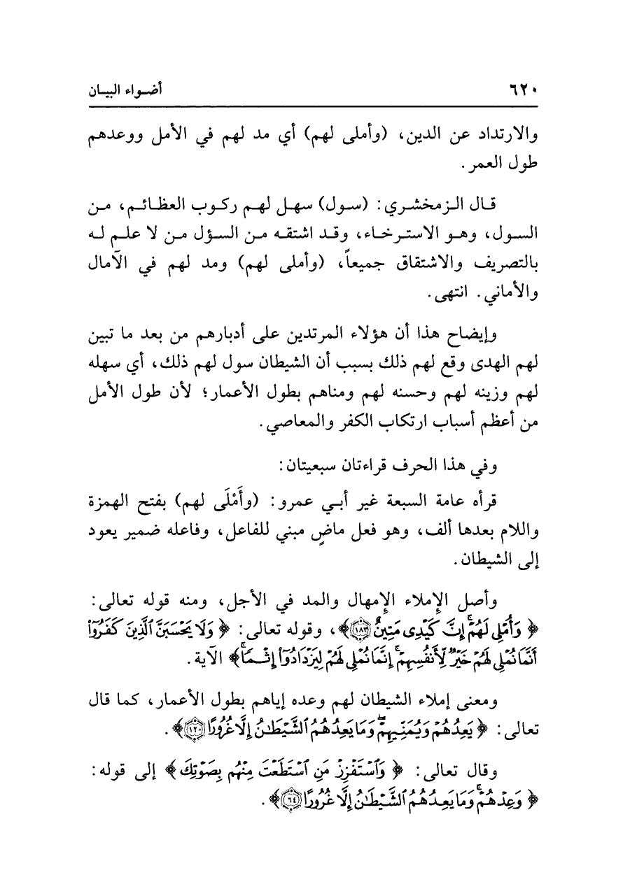 وإيضاح هذا أن هؤلاء المرتدين على أدبارهم من بعد ما تبين لهم الهدى وقع لهم ذلك بسبب أن الشيطان سول لهم ذلك، أي سهله لهم وزينه لهم وحسنه لهم ومناهم بطول الأعمار، لأن طول الأمل من أعظم أسباب ارتكاب الكفر والمعاصي.