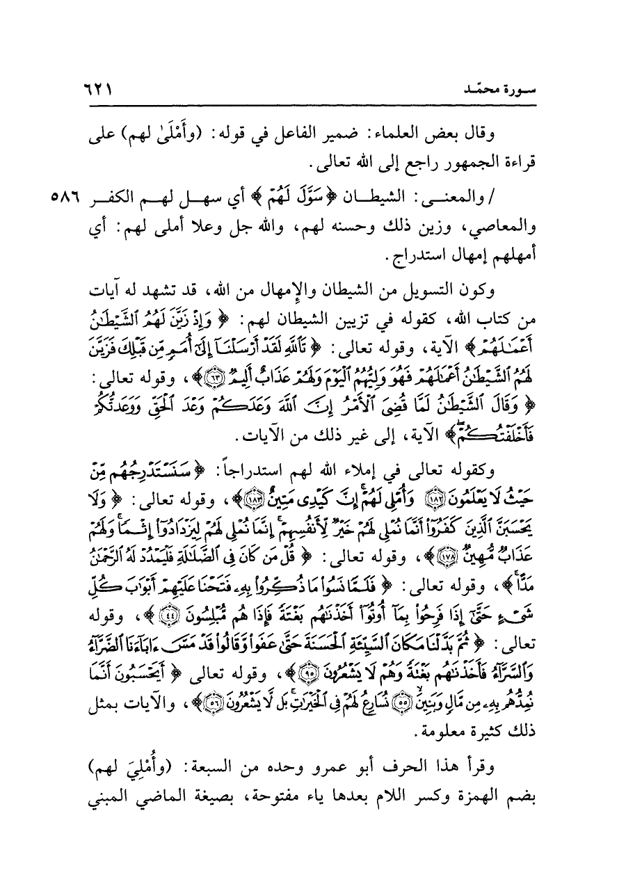 والمعنى: الشيطان {سَوَّلَ لَهُمْ} أي سهل لهم الكفر والمعاصي، وزين ذلك وحسنه لهم، والله جل وعلا أملى لهم: أي أمهلهم إمهال استدراج.