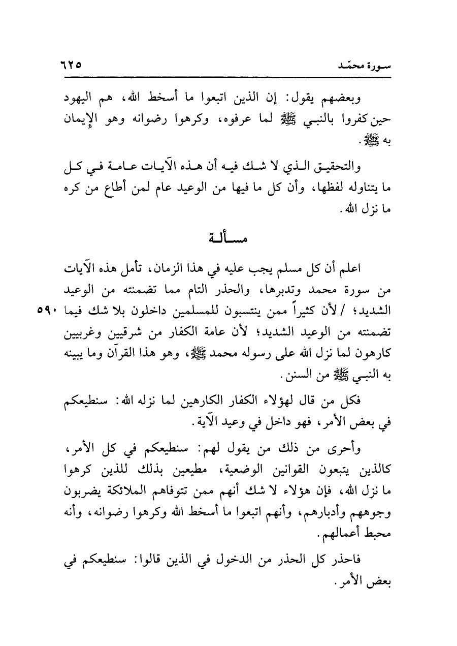 اعلم أن كل مسلم يجب عليه في هذا الزمان، تأمل هذه الآيات من سورة محمد وتدبرها، والحذر التام مما تضمنته من الوعيد الشديد؛ لأن كثيرًا ممن ينتسبون للمسلمين داخلون بلا شك فيما تضمنته من الوعيد الشديد؛ لأن عامة الكفار من شرقيين وغربيين كارهون لما نزل الله على رسوله محمد - صلى الله عليه وسلم - ، وهو هذا القرآن وما يبينه به النبي - صلى الله عليه وسلم - من السنن.