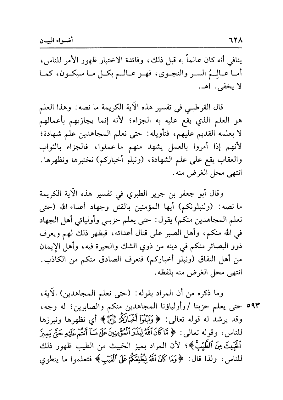 وقال أبو جعفر بن جرير الطبري في تفسير هذه الآية الكريمة ما نصه: (ولنبلونكم) أيها المؤمنين بالقتل وجهاد أعداء الله (حتى نعلم المجاهدين منكم) يقول: حتى يعلم حزبي وأوليائي أهل الجهاد في الله منكم، وأهل الصبر على قتال أعدائه، فيظهر ذلك لهم ويعرف ذوو البصائر منكم في دينه من ذوي الشك والحيرة فيه، وأهل الإِيمان من أهل النفاق (ونبلو أخباركم) فنعرف الصادق منكم من الكاذب. انتهى محل الغرض منه بلفظه.
