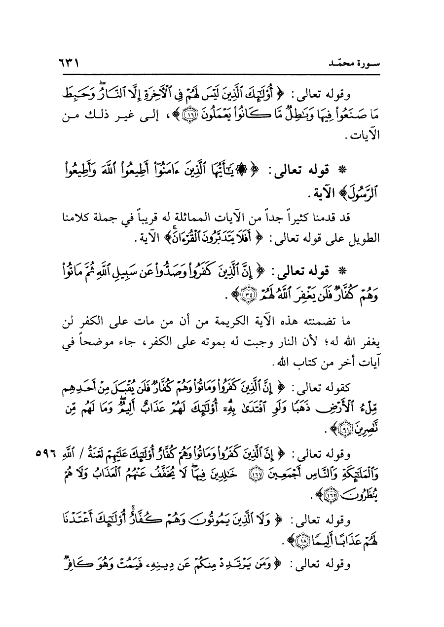 • قوله تعالى: {إِنَّ الَّذِينَ كَفَرُوا وَصَدُّوا عَنْ سَبِيلِ اللَّهِ ثُمَّ مَاتُوا وَهُمْ كُفَّارٌ فَلَنْ يَغْفِرَ اللَّهُ لَهُمْ (٣٤)}.