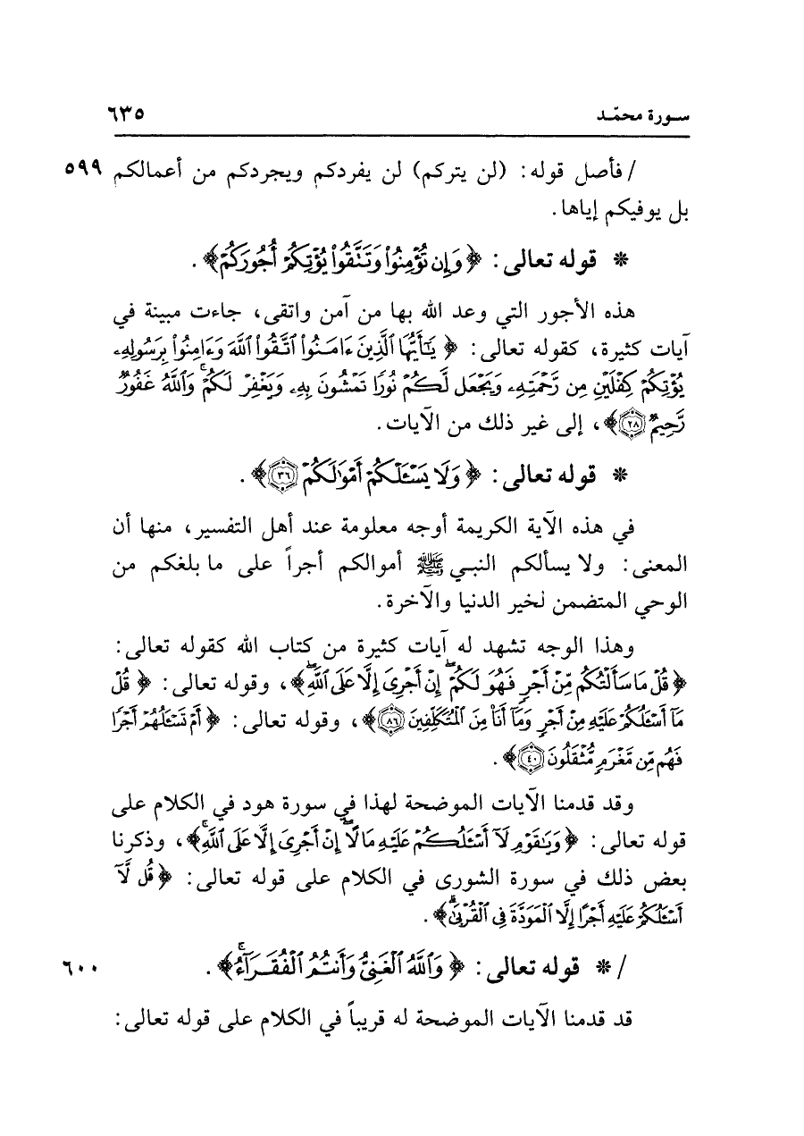 في هذه الآية الكريمة أوجه معلومة عند أهل التفسير، منها أن المعنى: ولا يسألكم النبي - صلى الله عليه وسلم - أموالكم أجرًا على ما بلغكم من الوحي المتضمن لخير الدنيا والآخرة.