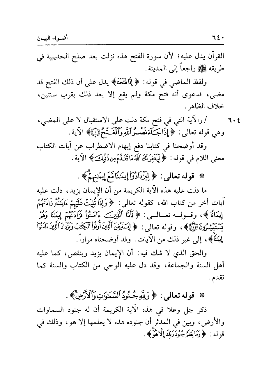ما دلت عليه هذه الآية الكريمة من أن الإِيمان يزيد، دلت عليه آيات أخر من كتاب الله، كقوله تعالى: {وَإِذَا تُلِيَتْ عَلَيهِمْ آيَاتُهُ زَادَتْهُمْ إِيمَانًا}، وقوله تعالى: {فَأَمَّا الَّذِينَ آمَنُوا فَزَادَتْهُمْ إِيمَانًا وَهُمْ يَسْتَبْشِرُونَ (١٢٤)}، وقوله تعالى: {لِيَسْتَيقِنَ الَّذِينَ أُوتُوا الْكِتَابَ وَيَزْدَادَ الَّذِينَ آمَنُوا إِيمَانًا}، إلى غير ذلك من الآيات. وقد أوضحناه مرارًا.