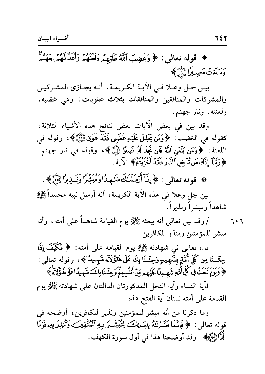 • قوله تعالى: {إِنَّا أَرْسَلْنَاكَ شَاهِدًا وَمُبَشِّرًا وَنَذِيرًا (٨)}.