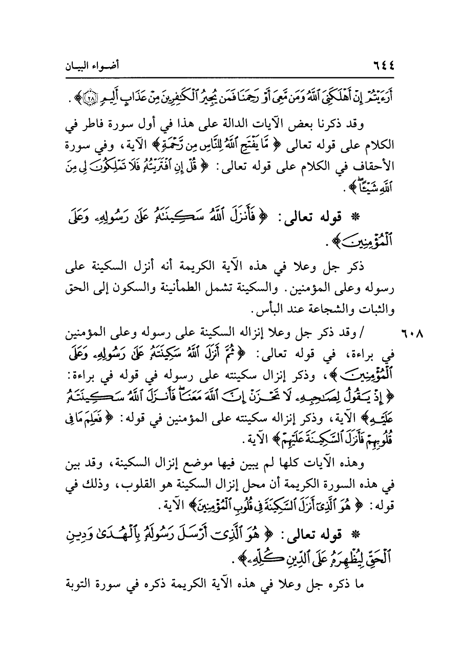 وقد ذكر جل وعلا إنزاله السكينة على رسوله وعلى المؤمنين في براءة، في قوله تعالى: {ثُمَّ أَنْزَلَ اللَّهُ سَكِينَتَهُ عَلَى رَسُولِهِ وَعَلَى الْمُؤْمِنِينَ}، وذكر إنزال سكينته على رسوله في قوله في براءة: {إِذْ يَقُولُ لِصَاحِبِهِ لَا تَحْزَنْ إِنَّ اللَّهَ مَعَنَا فَأَنْزَلَ اللَّهُ سَكِينَتَهُ عَلَيهِ} الآية، وذكر إنزاله سكينته على المؤمنين في قوله: {فَعَلِمَ مَا فِي قُلُوبِهِمْ فَأَنْزَلَ السَّكِينَةَ عَلَيهِمْ} الآية.