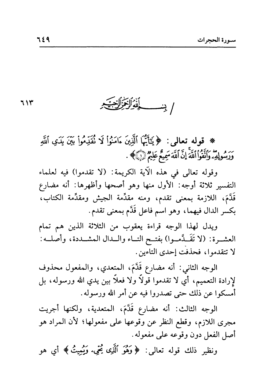 وقوله تعالى في هذه الآية الكريمة: (لا تقدموا) فيه لعلماء التفسير ثلاثة أوجه: الأول منها وهو أصحها وأظهرها: أنه مضارع قَدَّمَ، اللازمة بمعنى تقدم، ومنه مقدِّمة الجيش ومقدِّمة الكتاب، بكسر الدال فيهما، وهو اسم فاعل قَدَّم بمعنى تقدم.