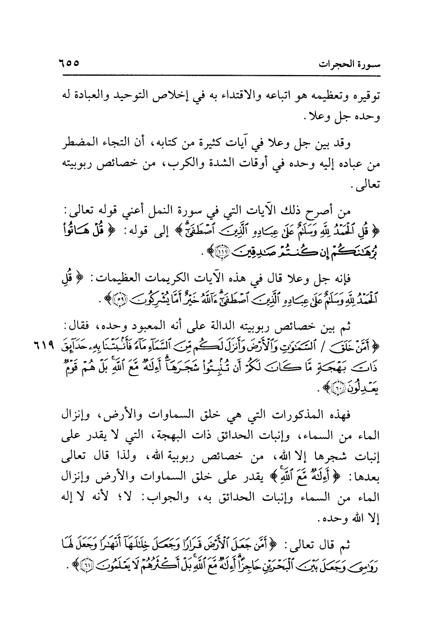 فإنه جل وعلا قال في هذه الآيات الكريمات العظيمات: {قُلِ الْحَمْدُ لِلَّهِ وَسَلَامٌ عَلَى عِبَادِهِ الَّذِينَ اصْطَفَى آللَّهُ خَيرٌ أَمَّا يُشْرِكُونَ (٥٩)}.