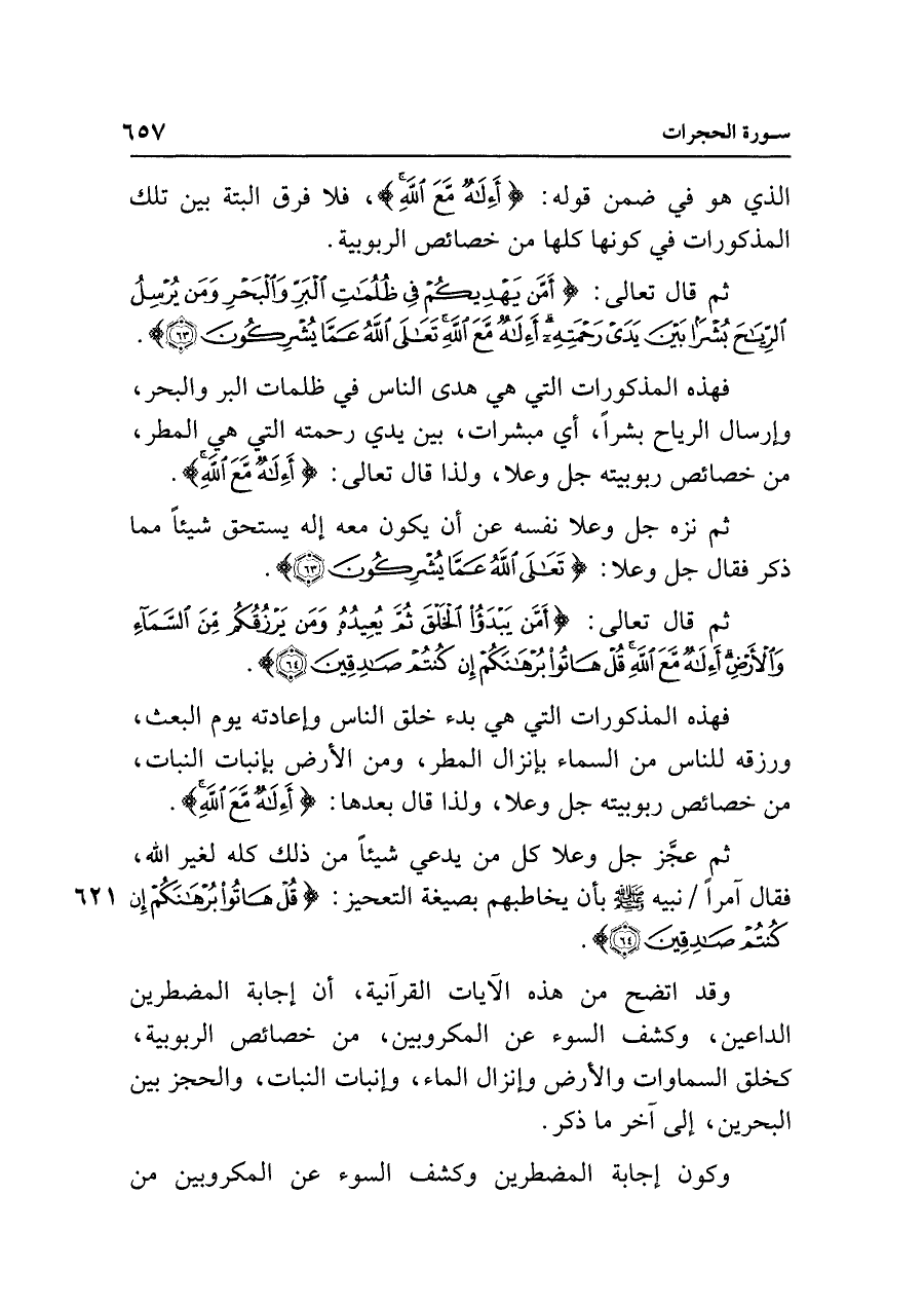 ثم قال تعالى: {أَمَّنْ يَهْدِيكُمْ فِي ظُلُمَاتِ الْبَرِّ وَالْبَحْرِ وَمَنْ يُرْسِلُ الرِّيَاحَ بُشْرًا بَينَ يَدَي رَحْمَتِهِ أَإِلَهٌ مَعَ اللَّهِ تَعَالى اللَّهُ عَمَّا يُشْرِكُونَ (٦٣)}.