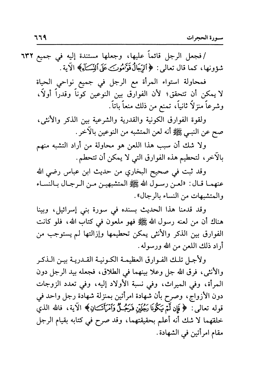 وقد قدمنا هذا الحديث بسنده في سورة بني إسرائيل، وبينا هناك أن من لعنه رسول الله - صلى الله عليه وسلم - فهو ملعون في كتاب الله، فلو كانت الفوارق بين الذكر والأنثى يمكن تحطيمها وإزالتها لم يستوجب من أراد ذلك اللعن من الله ورسوله.