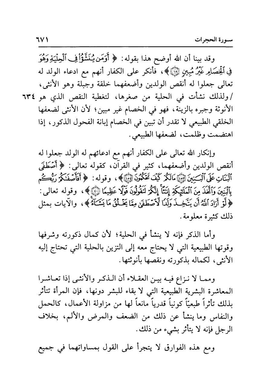 وقد بينا أن الله أوضح هذا بقوله: {أَوَمَنْ يُنَشَّأُ فِي الْحِلْيَةِ وَهُوَ فِي الْخِصَامِ غَيرُ مُبِينٍ (١٨)}، فأنكر على الكفار أنهم مع ادعاء الولد له تعالى جعلوا له أنقص الولدين وأضعفهما خلقة وجبلة وهو الأنثى، ولذلك نشأت في الحلية من صغرها، لتغطية النقص الذي هو الأنوثة وجبره بالزينة، فهو في الخصام غير مبين؛ لأن الأنثى لضعفها الخلقي الطبيعي لا تقدر أن تبير في الخصام إبانة الفحول الذكور، إذا اهتضمت وظلمت، لضعفها الطبيعي.