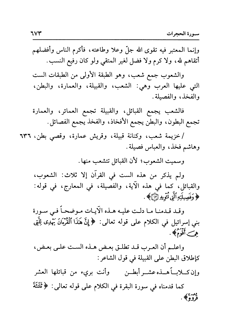 ولم يذكر من هذه الست في القرآن إلا ثلاث: الشعوب، والقبائل، كما في هذه الآية، والفصيلة، في المعارج، في قوله: {وَفَصِيلَتِهِ الَّتِي تُؤْويهِ (١٣)}.