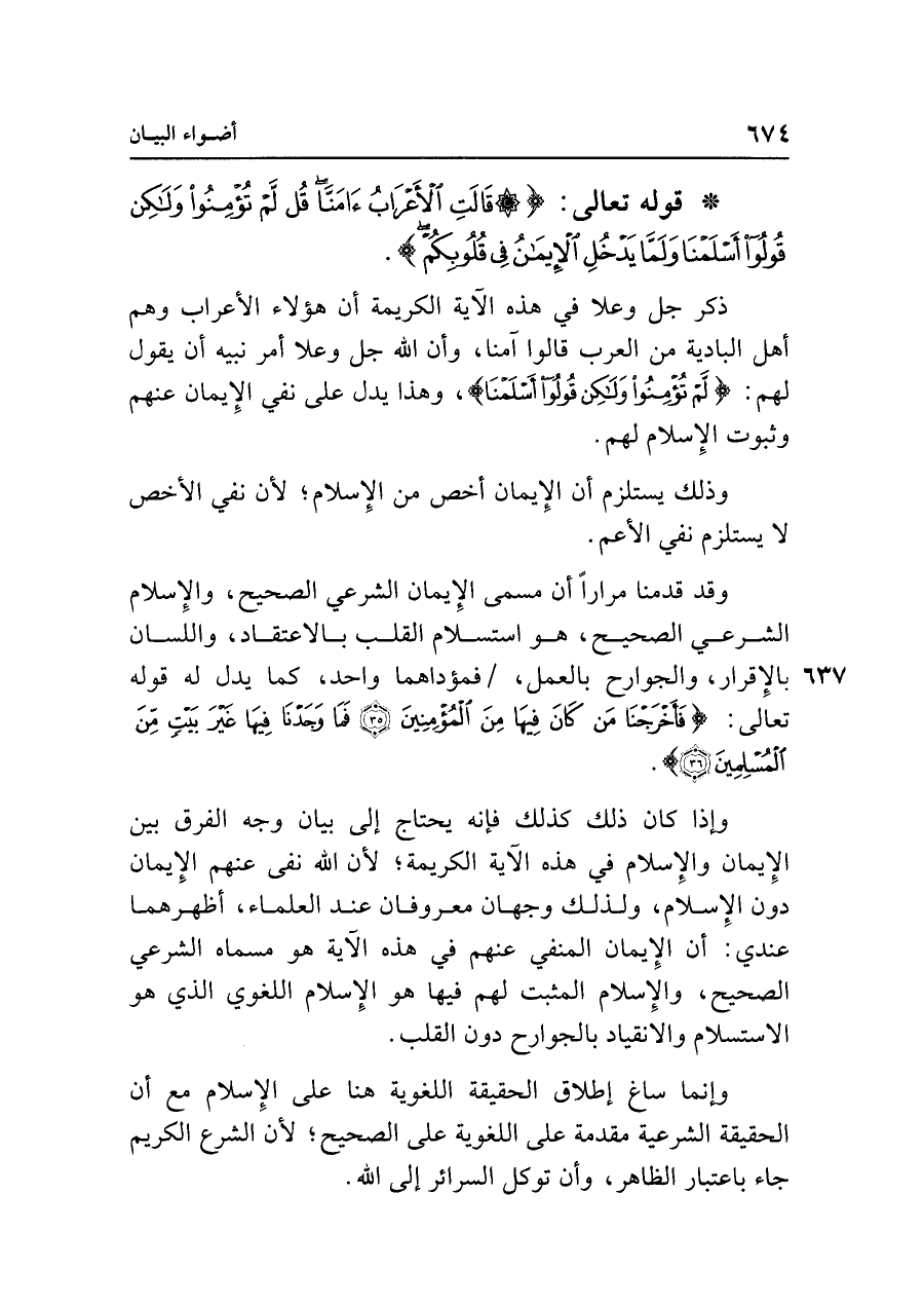وإذا كان ذلك كذلك فإنه يحتاج إلى بيان وجه الفرق بين الإيمان والإسلام في هذه الآية الكريمة؛ لأن الله نفى عنهم الإيمان دون الإسلام، ولذلك وجهان معروفان عند العلماء، أظهرهما عندي: أن الإيمان المنفي عنهم في هذه الآية هو مسماه الشرعي الصحيح، والإسلام المثبت لهم فيها هو الإسلام اللغوي الذي هو الاستسلام والانقياد بالجوارح دون القلب.