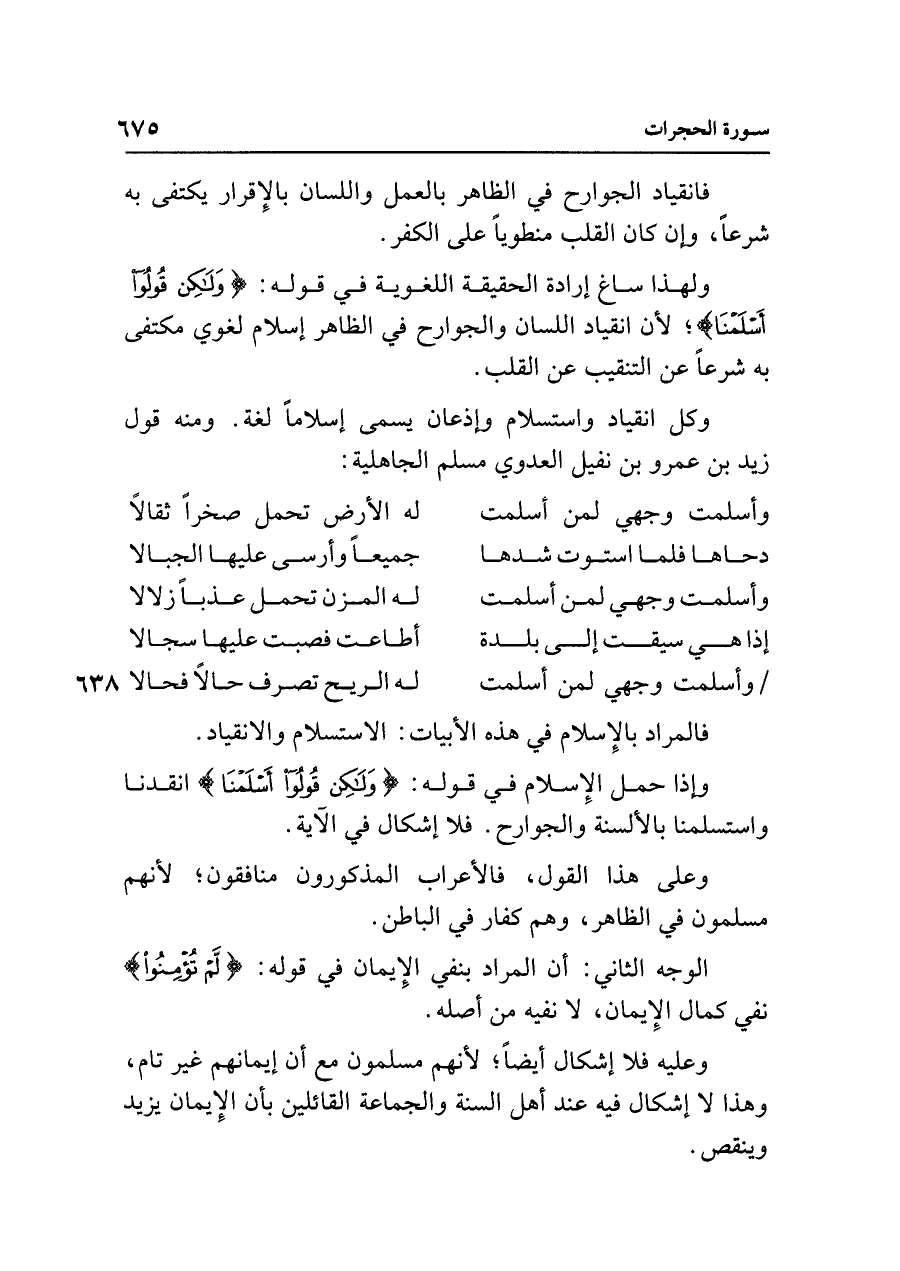 ولهذا ساغ إرادة الحقيقة اللغوية في قوله: {وَلَكِنْ قُولُوا أَسْلَمْنَا}؛ لأن انقياد اللسان والجوارح في الظاهر إسلام لغوي مكتفى به شرعا عن التنقيب عن القلب.