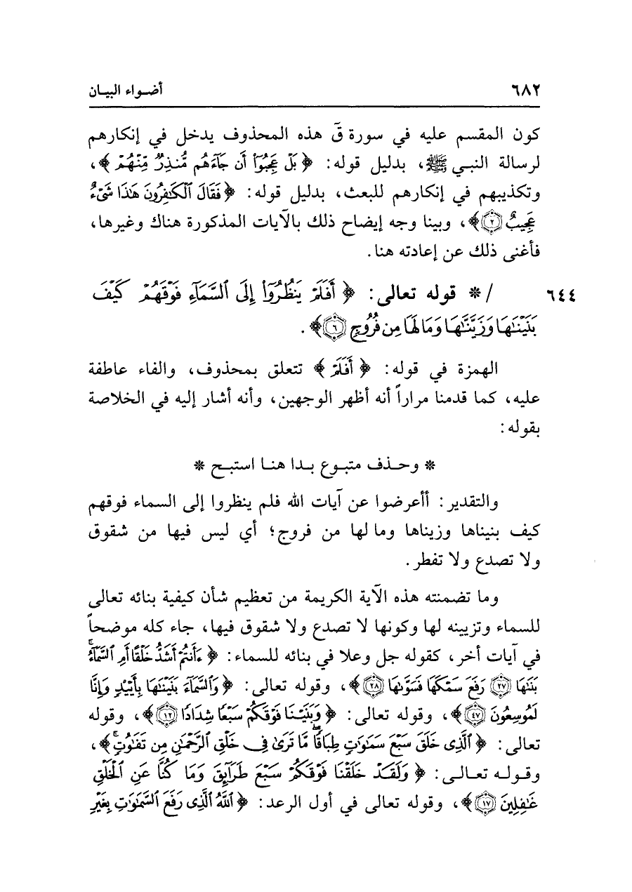 • قوله تعالى: {أَفَلَمْ يَنْظُرُوا إِلَى السَّمَاءِ فَوْقَهُمْ كَيفَ بَنَينَاهَا وَزَيَّنَّاهَا وَمَا لَهَا مِنْ فُرُوجٍ (٦)}.