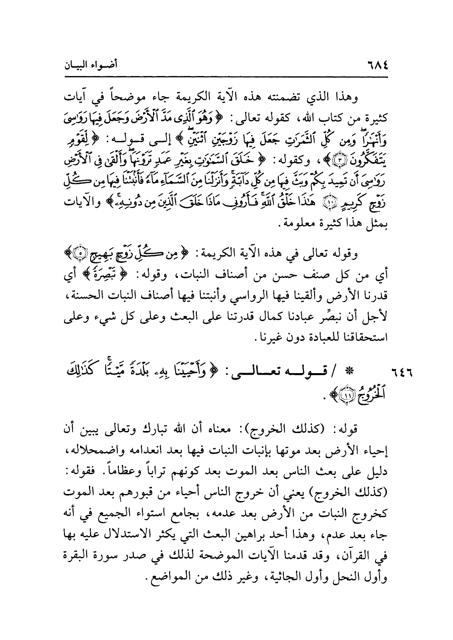 وهذا الذي تضمنته هذه الآية الكريمة جاء موضحًا في آيات كثيرة من كتاب الله، كقوله تعالى: {وَهُوَ الَّذِي مَدَّ الْأَرْضَ وَجَعَلَ فِيهَا رَوَاسِيَ وَأَنْهَارًا وَمِنْ كُلِّ الثَّمَرَاتِ جَعَلَ فِيهَا زَوْجَينِ اثْنَينِ} إلى قوله: {لِقَوْمٍ يَتَفَكَّرُونَ}، وكقوله: {خَلَقَ السَّمَاوَاتِ بِغَيرِ عَمَدٍ تَرَوْنَهَا وَأَلْقَى فِي الْأَرْضِ رَوَاسِيَ أَنْ تَمِيدَ بِكُمْ وَبَثَّ فِيهَا مِنْ كُلِّ دَابَّةٍ وَأَنْزَلْنَا مِنَ السَّمَاءِ مَاءً فَأَنْبَتْنَا فِيهَا مِنْ كُلِّ زَوْجٍ كَرِيمٍ (١٠) هَذَا خَلْقُ اللَّهِ فَأَرُونِي مَاذَا خَلَقَ الَّذِينَ مِنْ دُونِهِ} والآيات بمثل هذا كثيرة معلومة.
