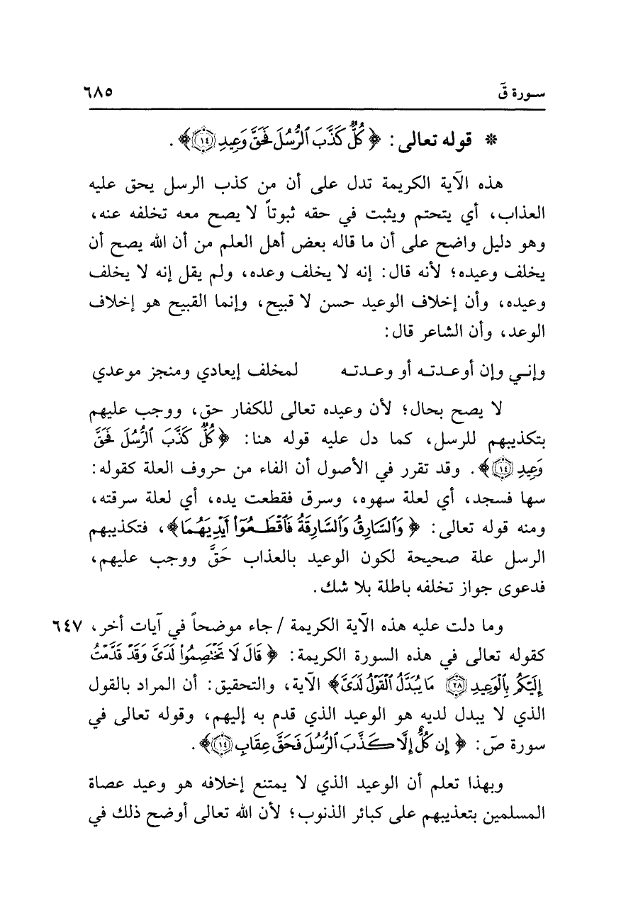 لا يصح بحال؛ لأن وعيده تعالى للكفار حق، ووجب عليهم بتكذيبهم للرسل، كما دل عليه قوله هنا: {كُلٌّ كَذَّبَ الرُّسُلَ فَحَقَّ وَعِيدِ (١٤)}. وقد تقرر في الأصول أن الفاء من حروف العلة كقوله: سها فسجد، أي لعله سهوه، وسروا فقطعت يده، أي لعلة سرقته، ومنه قوله تعالى: {وَالسَّارِقُ وَالسَّارِقَةُ فَاقْطَعُوا أَيدِيَهُمَا}، فتكذيبهم الرسل علة صحيحة لكون الوعيد بالعذاب حَقَّ ووجب عليهم، فدعوى جواز تخلفه باطلة بلا شك.