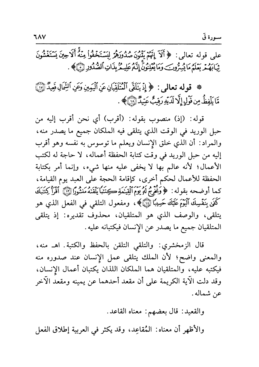 قوله: (إذ) منصوب بقوله: (أقرب) أي نحن أقرب إليه من حبل الوريد في الوقت الذي يتلقى فيه الملكان جميع ما يصدر منه، والمراد: أن الذي خلق الإنسان ويعلم ما توسوس به نفسه وهو أقرب إليه من حبل الوريد في وقت كتابة الحفظة أعماله، لا حاجة له لكتب الأعمال؛ لأنه عالم بها لا يخفى عليه منها شيء، وإنما أمر بكتابة الحفظة للأعمال لحكم أخرى، كإقامة الحجة على العبد يوم القيامة، كما أوضحه بقوله: {وَنُخْرِجُ لَهُ يَوْمَ الْقِيَامَةِ كِتَابًا يَلْقَاهُ مَنْشُورًا (١٣) اقْرَأْ كِتَابَكَ كَفَى بِنَفْسِكَ الْيَوْمَ عَلَيكَ حَسِيبًا (١٤)}، ومفعول التلقي في الفعل الذي هو يتلقى، والوصف الذي هو المتلقيان، محذوف تقديره: إذ يتلقى المتلقيان جميع ما يصدر عن الإنسان فيكتبانه عليه.