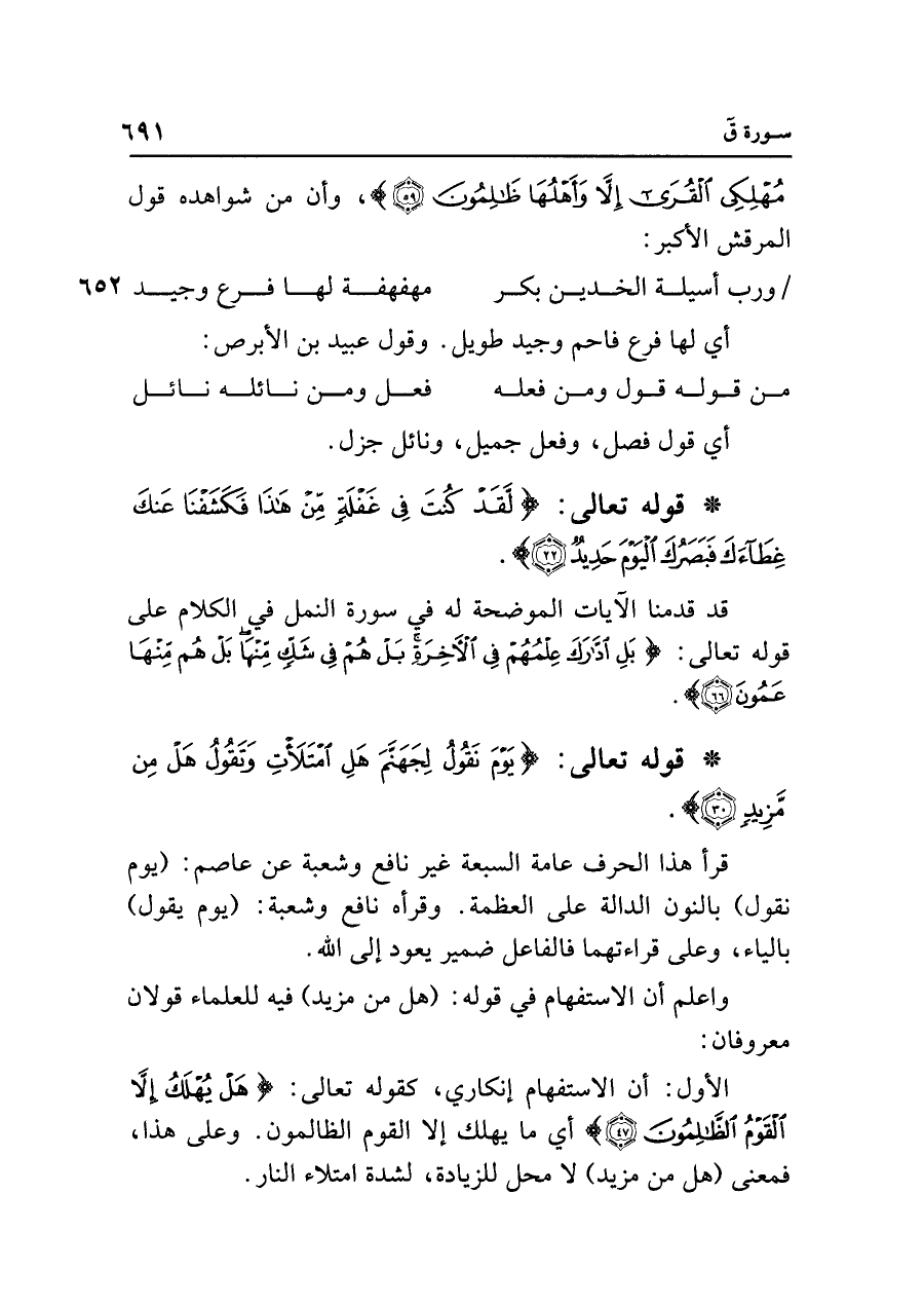 • قوله تعالى: {يَوْمَ نَقُولُ لِجَهَنَّمَ هَلِ امْتَلأْتِ وَتَقُولُ هَلْ مِنْ مَزِيدٍ (٣٠)}.