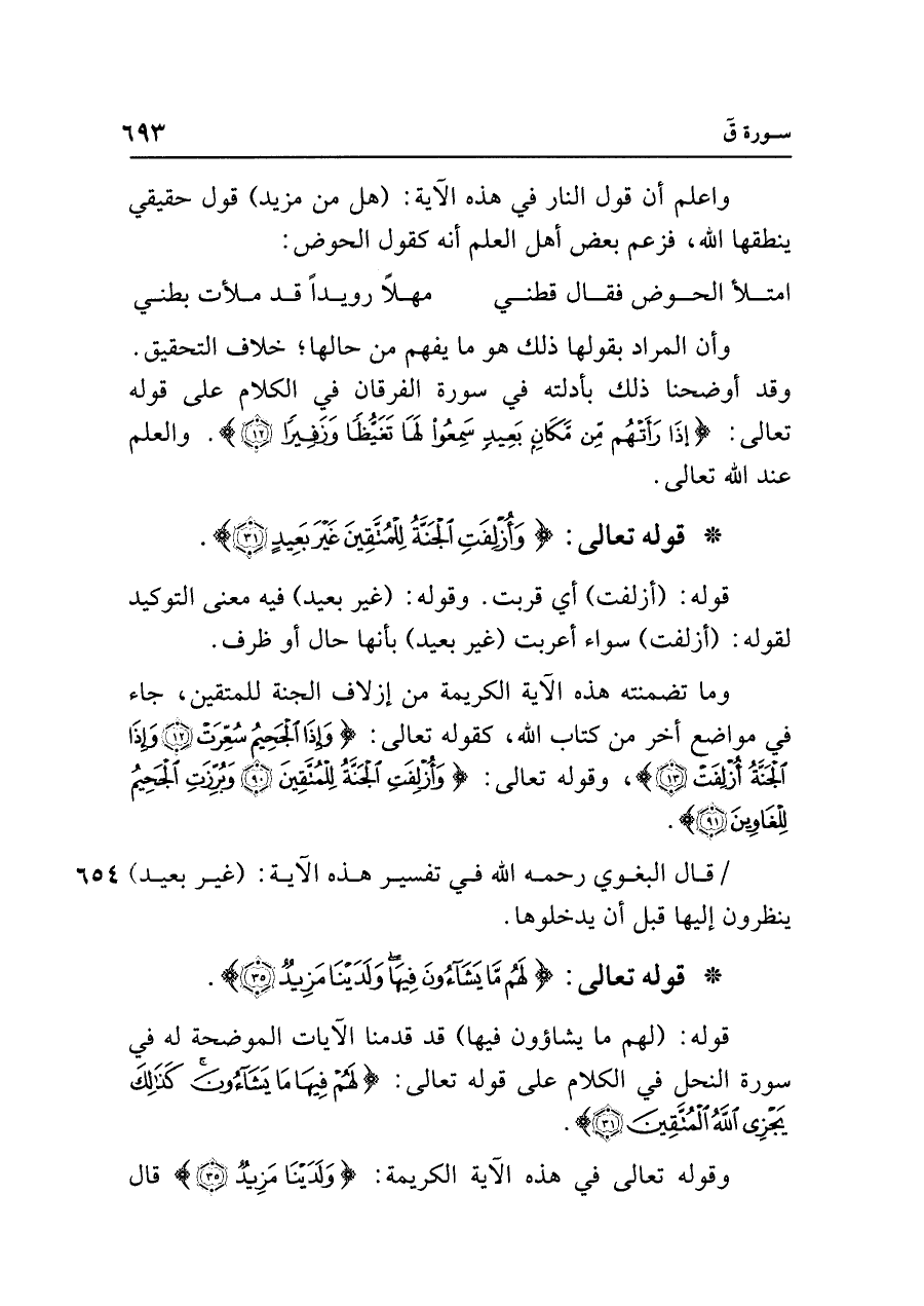 واعلم أن قول النار في هذه الآية: (هل من مزيد) قول حقيقي ينطقها الله، فزعم بعض أهل العلم أنه كقول الحوض: