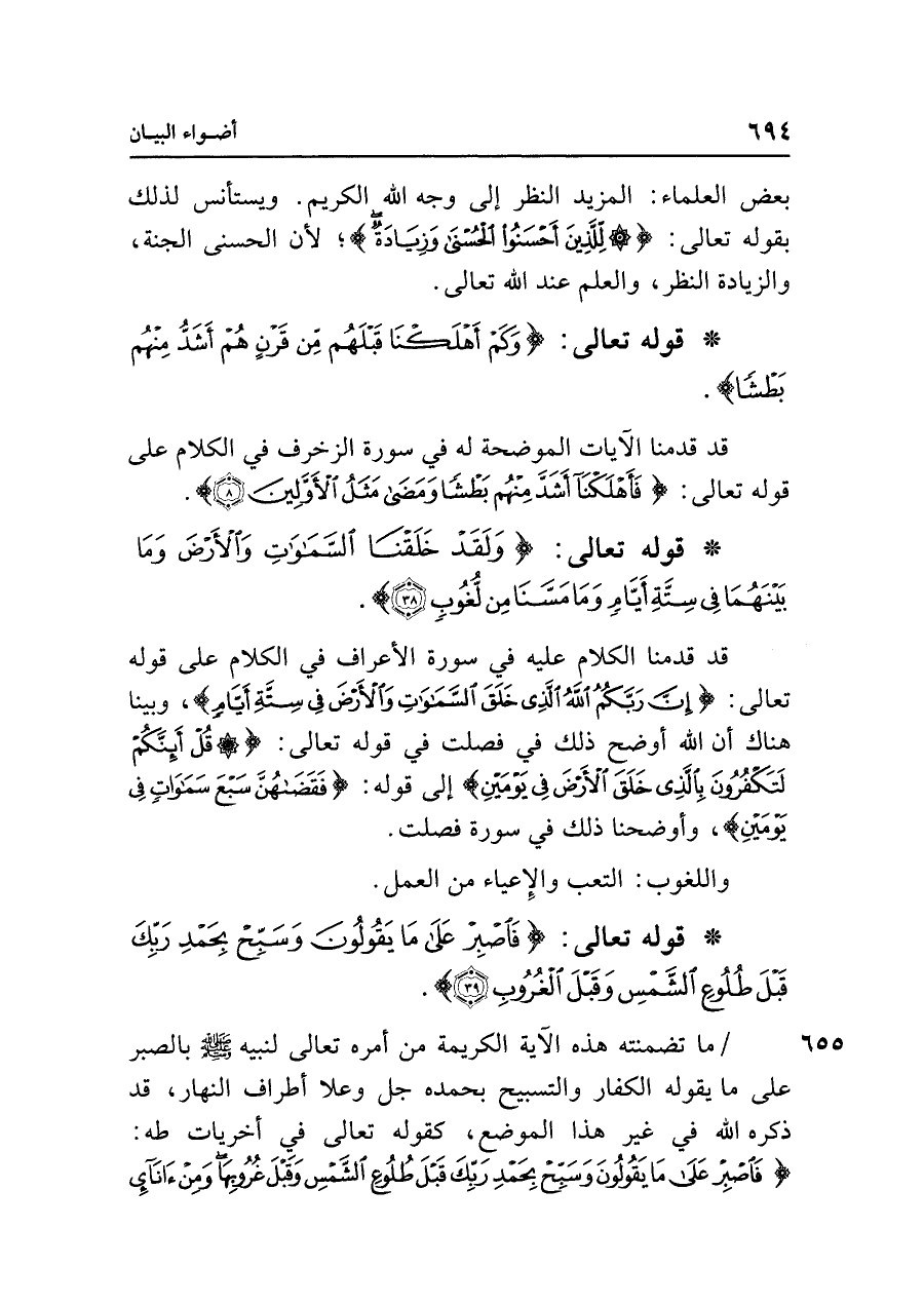• قوله تعالى: {وَلَقَدْ خَلَقْنَا السَّمَاوَاتِ وَالْأَرْضَ وَمَا بَينَهُمَا فِي سِتَّةِ أَيَّامٍ وَمَا مَسَّنَا مِنْ لُغُوبٍ (٣٨)}.